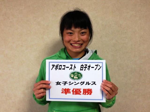 白子オープン(日本ランキング一般大会)押野紗穂さんが準優勝! 押野紗穂さんが、日本ランキングのポイントが入る一般大会に出場しました。 ワイルドカード(大会推薦者枠)大会を勝ちあがり、本戦出場の切符をつかみ 本戦でも大人を相手に勝ち進み、準優勝いたしました! 今後は一般大会での活躍も楽しみです。 2013アポロコースト 白子オープン in スプリング 女子シングルス 準優勝 押野紗穂さん(ワールドツアークラス)