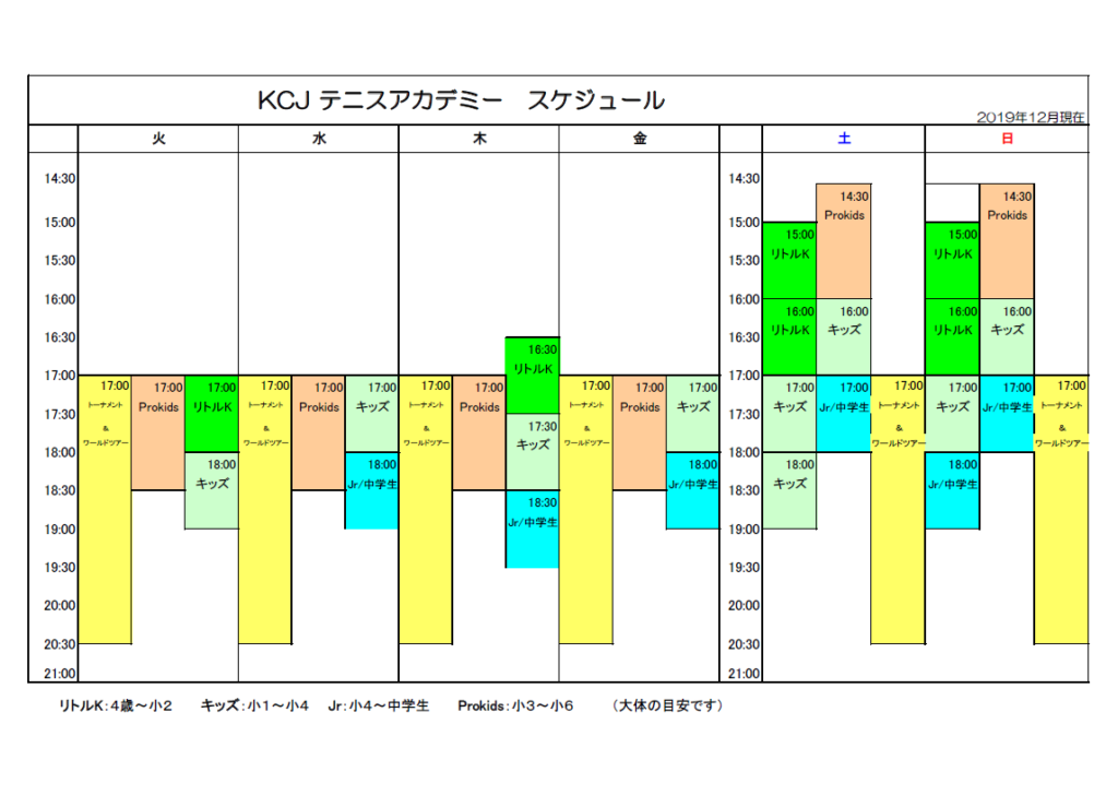 その他のおもな変更点はコート1面にコーチが必ず1人入り、小人数予約制(先着最大6人)で子供同士の至近距離での会話や接触を避けるよう指導いたします。60分と90分のレッスンのみ(別欄参照)となり、受講時間が短くなるクラスもありますが少人数で細かい指導ができるかと思います。悪天候以外のキャンセルは予約に漏れた方に多大な迷惑となりますので極力避けてください。細かい注意点なども別欄に載せておきますのでご確認ください。