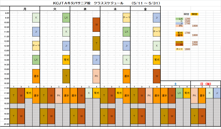 自粛要請の延期、水郷コートの5/31までの閉鎖などを受け、5/10まで休講となっていたレッスンを5/11よりKCJ全校生徒向けに牛久パサニア校にて開講いたします。4月分として受領した受講料は6月分に当てさせていただき、5月は臨時対応的レッスンとして、新たなスケジュールと料金を設定させていただきました。60分と90分のレッスンのみ(別欄参照)となります。受講料についてはすべて1回毎の単発形式(クラス別)になることをご容赦ください。