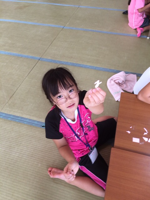 ゲームでいっぱい動いてお腹も空いて来た頃の心の輪は、かなりの難題でした。 みんな徐々に集中力が切れてきて、なかなか上手く伝達できませんでしたが、 ここぞってところの集中力はさすがで、なんとかみんなの心を繋ぐことができました。