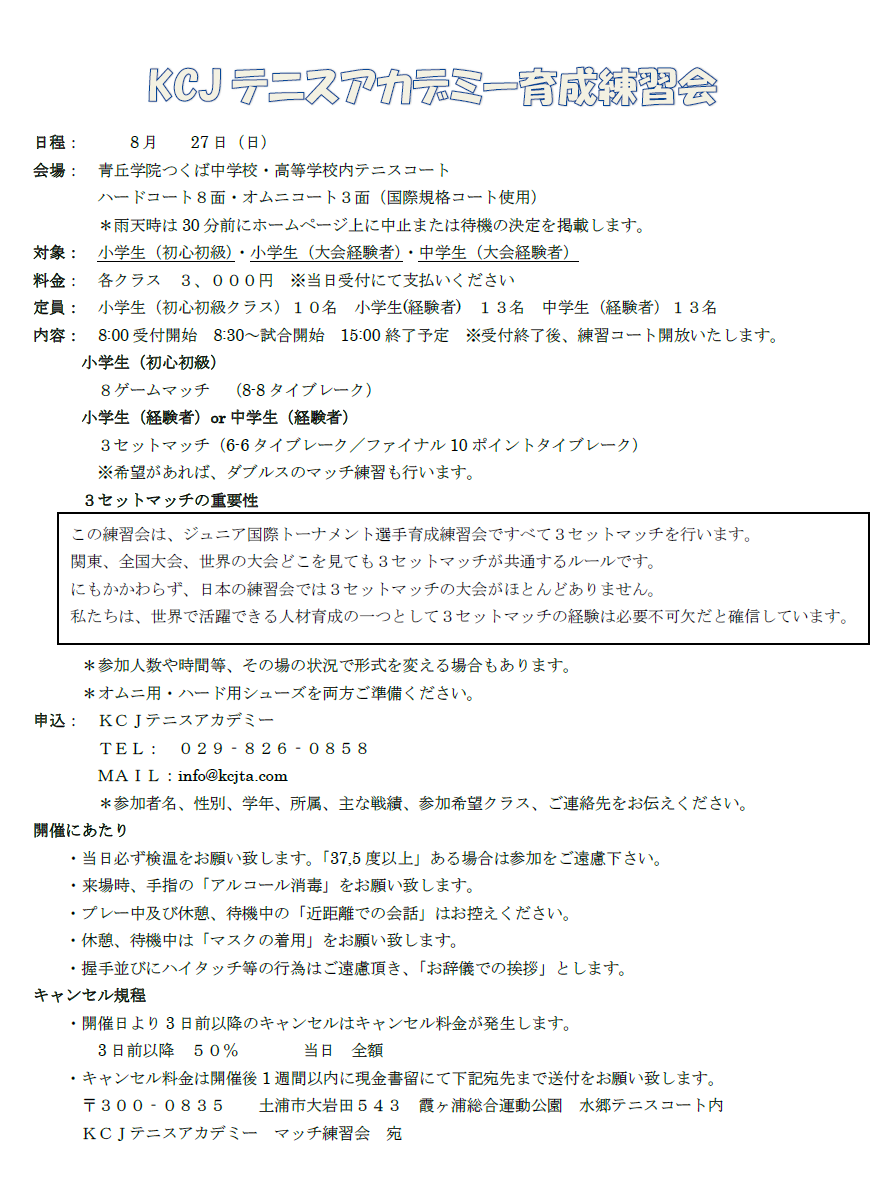 KCJテニスアカデミー育成練習会 8月27日