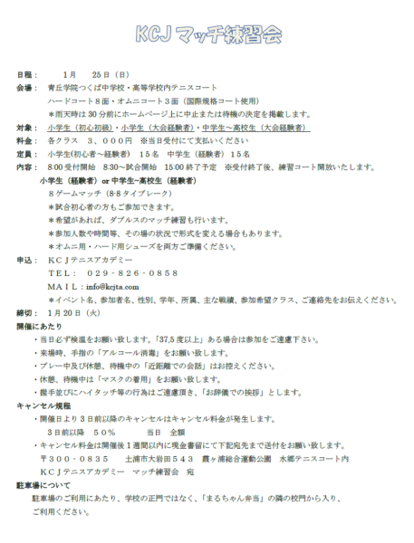 KCJテニスアカデミー育成練習会開催中止のお知らせ