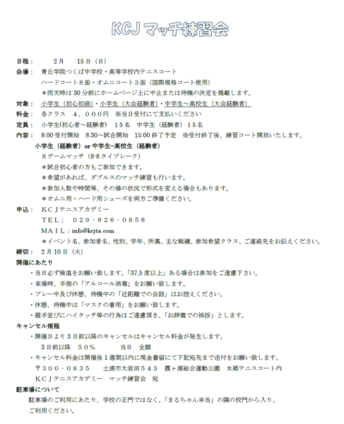 KCJテニスアカデミー育成練習会開催中止のお知らせ