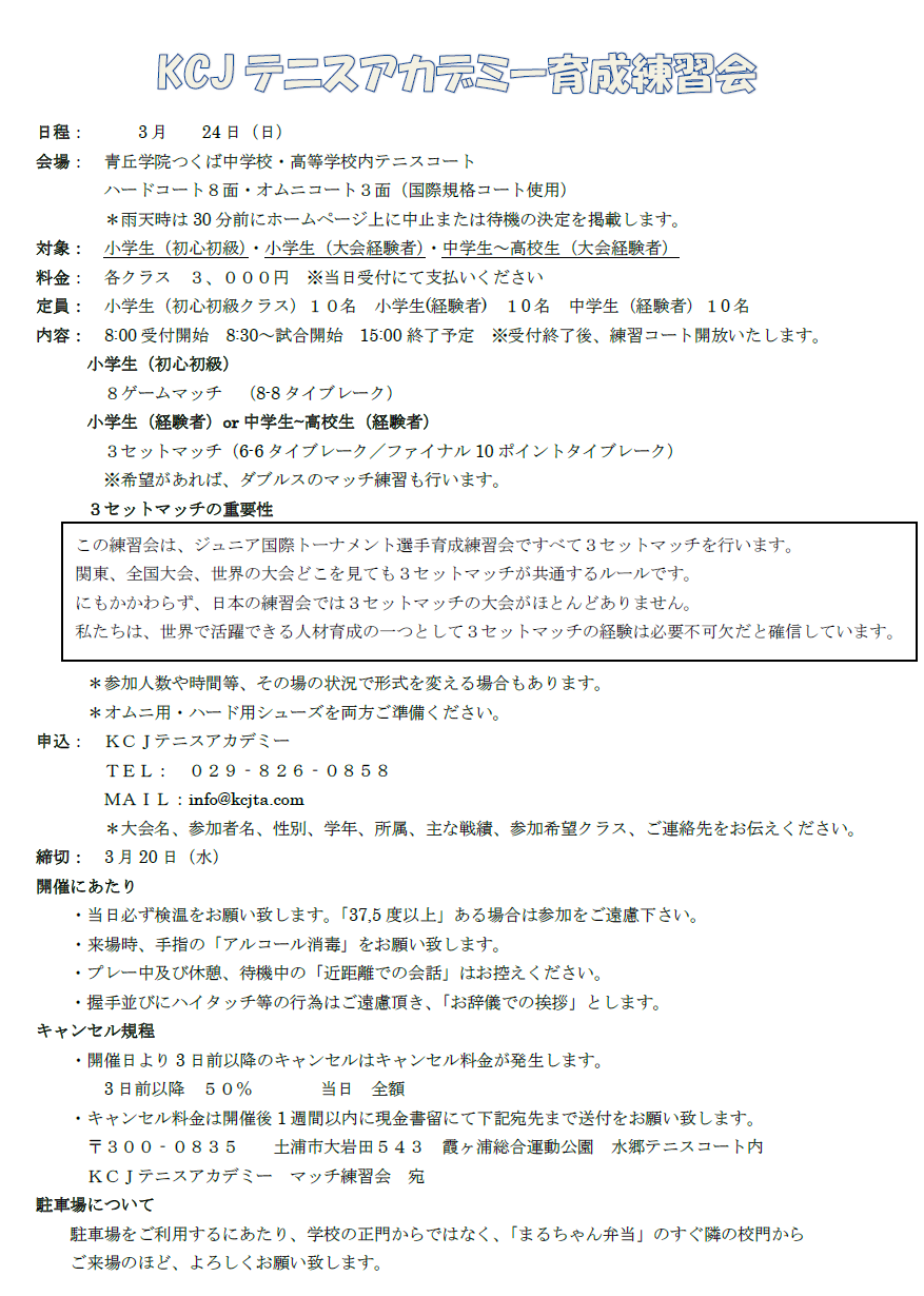 KCJテニスアカデミー育成練習会 1月21日 開催中止のお知らせ