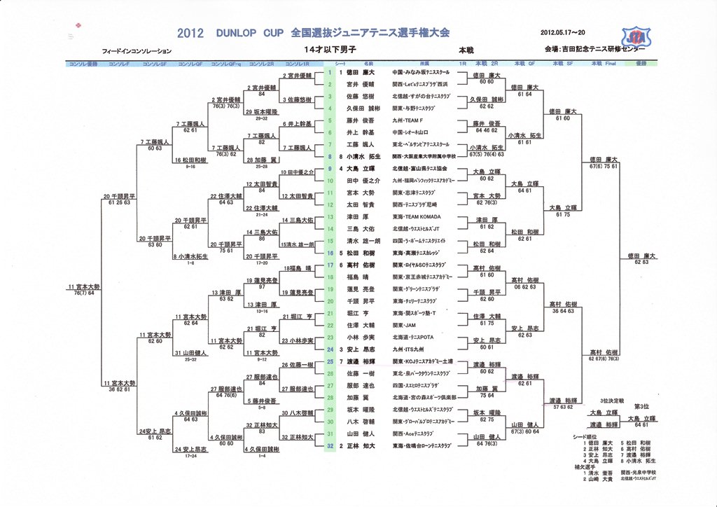 渡邉裕輝くんが、全国4位! 全国選抜ジュニアテニス選手権大会 兼ワールドジュニアテニス世界大会代表選考会が行われ 渡邉裕輝くんが、全国4位に入賞いたしました! 前回の中学生大会優勝に続きと安定した強さを見せています。 全国1位目指し、猛練習しております。 この後も大会が続きますので、応援よろしくお願いいたします。 試合結果※クリックで拡大します。